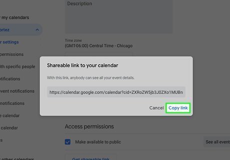Click Copy link in the pop-up. This will copy the direct URL link to your calendar.