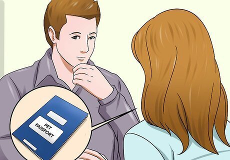 Obtain a pet passport for your pet. Many vets can provide a pet passport for your pet. If your vet does not have access to a pet passport, ask her to refer you to a vet nearby that does give out pet passports or contact the Animal and Plant Health Agency of the UK here: https://www.gov.uk/government/organisations/animal-and-plant-health-agency/about/access-and-opening. You should check that your vet has filled out the following information in the passport: The details of ownership, including the full owner name(s). A full description of the animal. Any identifications of the animal, such as the microchip information. Confirmation of vaccination against rabies, as well as rabies blood tests. Confirmation of tapeworm treatment, if applicable.