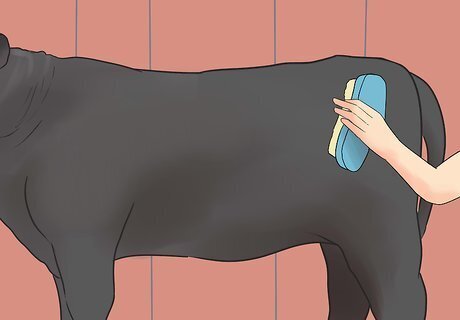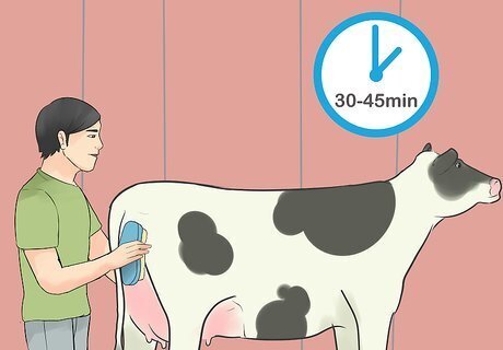 Brush in a conditioner 30 to 45 minutes before the show begins. Begin by brushing in a conditioner over your heifer's entire body, excluding the legs. Brush the hair forward to create a fluffy look. Then go over the hair with a dryer. Make sure all of the hair is completely dry. Any hair clipping should have been done before you arrived at the show.