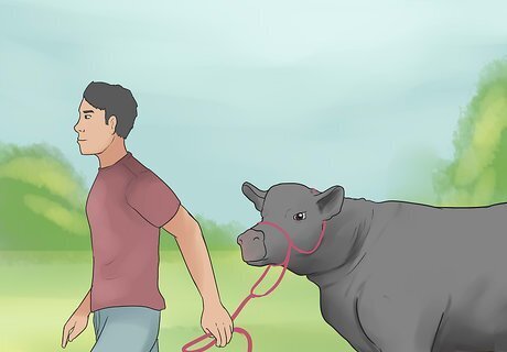 Halter-break your calf. To halter-break your calf, start by fitting a nylon rope halter on the calf's head. At first, let the calf walk around the ring by itself with the halter. As the calf walks, it will inevitably step on the halter, creating resistance. The resistance will get it accustomed to the pressure it will feel when you begin to lead it. It will take about a week to halter train your calf.