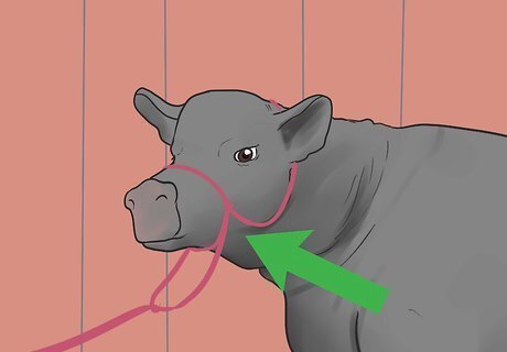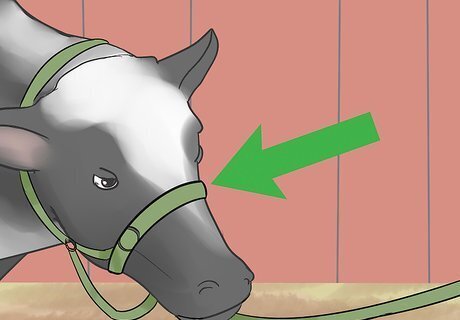 Place the show halter on your heifer's head. Show halters are usually made of leather with a chain-leather lead strap. Make sure the halter is fitted correctly on your heifer. The nosepiece should be up on the nose about halfway between the eyes and nose.