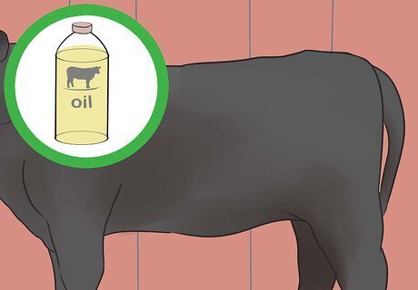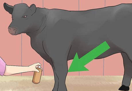 Mist your heifer with show oil. Before you step into the make-ready area, mist your heifer's entire body with show oil. The show oil adds shine to your heifer's coat. If the show does not allow aerosol cans in the make-ready area, then you will need to apply the oil in the chute where the rest of the grooming takes place. You can purchase show oil from specialty cattle or livestock show stores.