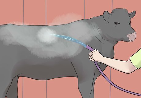 Wash and dry your heifer an hour and a half before the show. Washing and drying your heifer will prep it for grooming later on before the show starts. Rinse your heifer with water until all of the hair is completely wet. Apply a shampoo and rinse again until all of the shampoo is gone. Then dry your heifer with a dryer. Make sure all of the hair is completely dry.