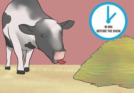 Feed your heifer an hour and a half before the show starts. Feed your heifer stomach fillers like beet pulp, cottonseed hulls, and alfalfa. Like water, these types of food will help fill out your heifer's stomach, making it look healthier. You may also water it at this time. However, some owners wait until right before the show to water their heifers. For example, if the show starts at 9 a.m., then your heifer should be fed by 7:30 a.m. Re-feed your heifer a half feeding at noon or midday if the show runs long or starts late. Feeding your heifer earlier rather than later will allow it to rest and save its energy before the show begins.