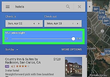 Select your maximum price. Use the “Max price/night” slider beneath the Check In and Check Out dates to cap your results under a certain amount. Again, the prices will recalculate. The price is listed per-night, not per-stay. Prices do not usually include tax.
