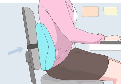 Support your lower back. One of the biggest causes of back pain at work is not properly supporting your lower back. It’s best to have an adjustable chair with support, but if this isn’t available, you can modify your desk space to make yourself more comfortable. If your chair doesn’t have back support, consider putting a pillow between your back and the chair to give your lower back extra support. You can also use this pillow to hold in an ice pack to help further alleviate your pain. A footrest may help to support your lower back further.