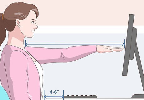 Place your computer at an optimal level. Having your computer and its accessories close to you can help ensure that you are sitting properly and not having to contort your head and neck to work. This in turn can help relieve and prevent back pain. Your screen should be at eye level about an arm’s length away. Your keyboard should be 4–6 inches in front of you. Keep your mouse as close to you as possible so that you’re not bending your back in any way to reach it. If you have papers on your desk while typing, try attaching them with a clip to your computer screen. That way, you won’t be bending your neck to the side while typing.