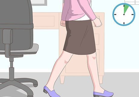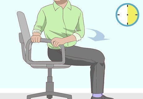 Schedule intermittent breaks from sitting. If you sit for long periods of time, it’s important to take breaks during the day. This will stretch out and relax your muscles, and may also help further relieve back pain. Take a five minute walking break every hour if possible. During your lunch break, considering going for a walk or doing some other type of activity to stretch and relax your back. Another option at break time is to stand up and realign the body before sitting. When standing, gently squeeze the buttocks for 10 seconds. Keep the stomach tight and gently roll your shoulders back, and then let your shoulders relax. These movements helps to contract and activate muscles that may not get any work while sitting.
