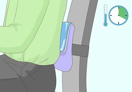 Apply an ice pack on your back. Once you’re sitting comfortably, place an ice pack on the area of your back that is causing you pain. This may offer you some immediate pain relief and reduce inflammation that is exacerbating your discomfort. Keep the pack on the affected area for at least 20 minutes per session. Doing it for any less time may only cool your skin and not have any affect on your underlying muscle tissue. You can ice your back up to five times a day with at least 45 minutes in between treatments. If you are having a hard time keeping the pack on your back, try keeping it in place with a towel or some elastic wrap.