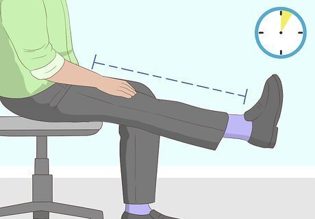 Perform hamstring stretches while sitting. The hamstring muscles can get tight while sitting. Performing dynamic stretches can help you keep them loose, reducing tightness in the back. Sit with feet flat on the ground, looking straight ahead. Slowly begin straightening your right leg for five seconds. Once the leg is straight, hold for a second and then gradually bring it back down for another count of five. Repeat repeat more times. Then repeat with the other leg.