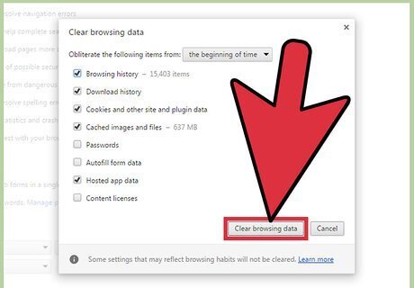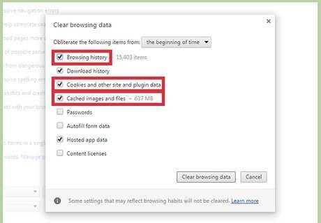 Select the type of data you would like to erase. Check the box next one or more of the following options: “Browsing history” “Cookies and other site and plugin data” “Cached images and files”.