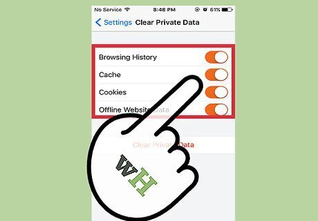 Slide the toggle buttons from left to right to select the types of information you want to clear. By default, the following options are selected: “Browsing History” “Cache” “Cookies” “Offline Website Data”