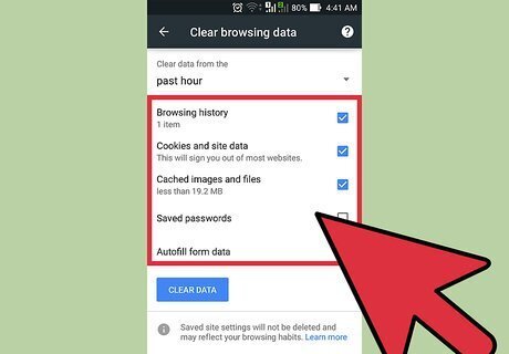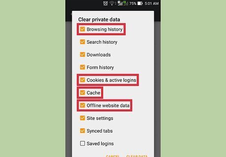 Check the boxes next to the type of data you would like to clear. Options include: “Browsing & download history” “Cookies & active logins” “Cache”