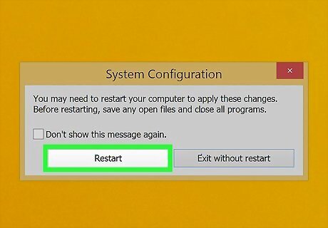 Click Restart. It's in the pop-up that appears when you click Ok. Your computer will boot into safe mode. Windows will keep booting into Safe Mode until you disable it. To disable Safe Mode, repeat these steps to open the System Configuration utility, click the Boot tab, and uncheck the "Safe Mode" option. Click Apply and reboot your computer.