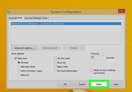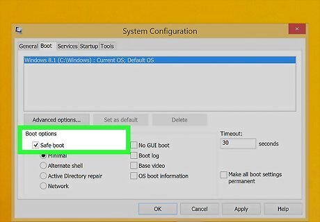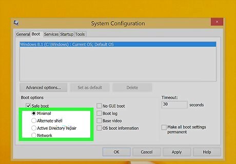 Select a boot option. Click the radio button next to the boot option you want. Your options are as follows: Minimal: This boots Windows in safe mode with the standard Windows graphical user interface (GUI), but with minimal drivers and services. You can use this option to fix most problems. Active Directory Repair: This starts Windows in safe mode with access to hardware information. Use this option if you need to repair corrupt files in the Active Directory. Network: This starts Windows in safe mode with network drivers enabled. This allows you to connect to the internet while in safe mode. Alternate Shell: This option boots Windows into a command prompt interface with no graphical user interface. This option is for advanced users only.