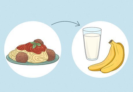 Don’t eat heavy meals before bed. Eating too much right before you sleep can affect your sleep quality, and it might make you more likely to sleep talk. Avoid foods that are spicy or fatty in particular, since those can be harder to digest and are more likely to disrupt your sleep. On the other hand, some foods may help you sleep better at night. Try having a light snack of bananas, turkey breast, or berries in the evening. Milk or fish may also help.