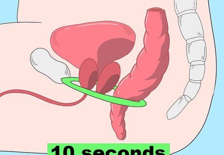Hold each squeeze for 10 seconds as the exercise gets easier. You can start by holding each squeeze for 10 seconds, and work your way up to higher intervals. Holding each squeeze will flex and further strengthen the pelvic floor muscles. You should only increase the difficulty of the exercises once can fully engage your pelvic floor. Be patient with yourself if this task seems difficult to complete. Just like any other muscle in the body, it is going to take time and repetition to strengthen your pelvic floor muscles.