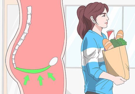 Tighten your pelvic floor muscles before lifting objects. While you should avoid lifting weights until your urine leakage lessens, it is inevitable that you are going to have to lift something in your everyday life. Before you lift that grocery bag, tighten your pelvic floor muscles to alleviate the strain. If you tighten your pelvic muscles before you cough or sneeze, you will train your body to instantly tighten when under stress. The method is often referred to as, “The Knack.”