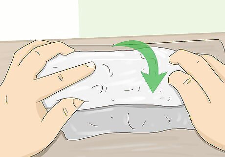 Wrap the banana bread in the plastic wrap. Set the bread on the edge of the plastic wrap so the long side of the plastic wrap runs parallel to the width of the bread. Wrap the plastic wrap around the bread several times until you've used up the whole piece you tore off. Fold the edges of the plastic wrap in and around the loaf of bread so none of the bread is exposed. The plastic wrap will keep air away from the surface of the bread so it stays fresh longer.