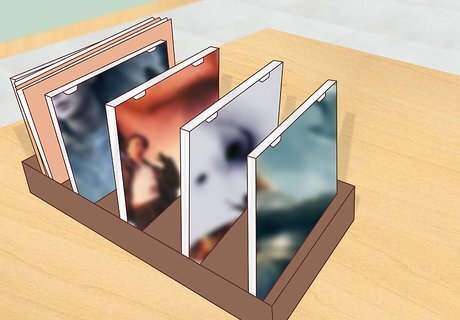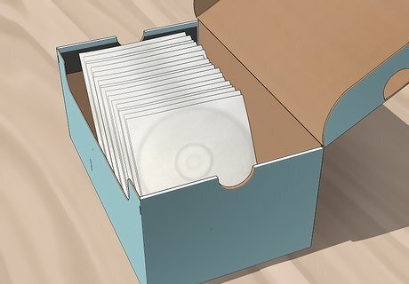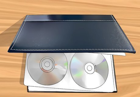Store your CDs or DVDs in a CD carrying case. A CD carrying case is a thick booklet with small plastic flaps that hold individual CDs and DVDs. To store large amounts of CDs or DVDs, put them into a case like this and store it in a cool, dry place that doesn’t get too warm or humid. Try keeping them in a closet or under your bed so they’re out of the way.