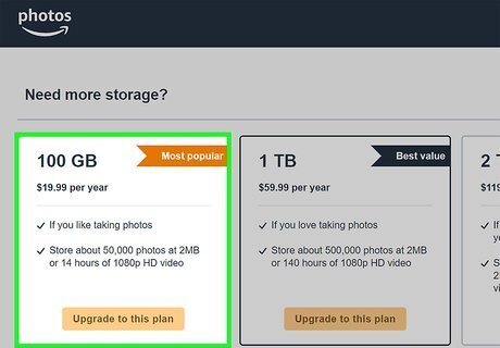 Purchase more cloud storage if you have a lot of photos. Often, devices will offer their cloud services up to a certain amount before you have to pay a subscription fee. If you are going to be uploading a lot of photos, you can purchase more space. The fee depends on the subscription service, but it is often around $5 per month for extra storage.
