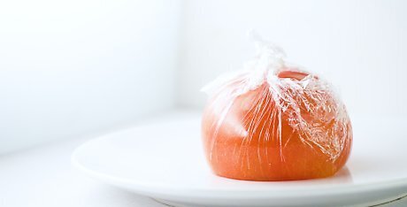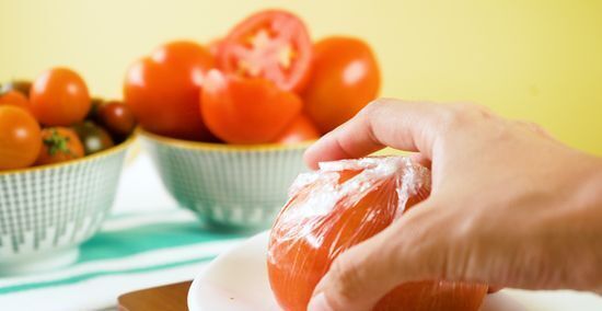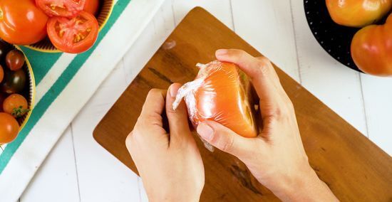 Wrap plastic wrap around the cut side of the tomato. Pull out a sheet of plastic wrap. Set your tomato on the plastic wrap with the cut side facing down. Cut the plastic or tear it off. Wrap the plastic around the cut side and pull it taut. Gently layer the excess portion of the plastic around the uncut skin near the area where the membrane is exposed from your cut. Press the excess plastic against the skin to partially cover the fruit.Tip: Wrapping an uncut tomato will usually make it go bad faster than it normally would. It will prevent a cut tomato from drying out, though. If the tomato was cut unevenly, trim the tomato so that the exposed portion is flat and even. If you’re storing slices of tomato, stack them together and wrap the entire set like you’re wrapping a whole tomato. You don’t actually want to wrap the entire fruit and the plastic wrap doesn’t need to be tight around the uncut portion of the skin. A little airflow is good for the tomato.