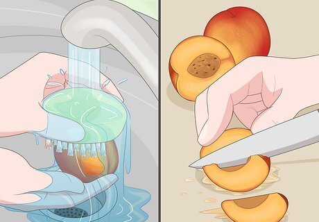 Wash and cut ripe nectarines. Use a soft-bristled brush with cool water to make cleaning a bit easier. Slice them in half and remove the pit. You can cut them into any size you wish but keep them around the same size.