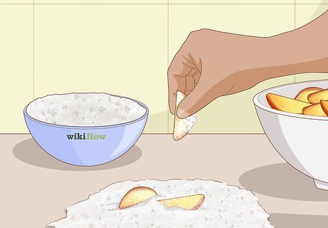 Roll the nectarines around in white sugar. Make sure all sides are coated evenly. Sugar helps the fruit to retain its shape when it is thawed later.