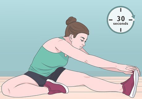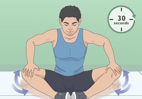 Do a butterfly stretch to loosen your thighs and hips. Sit down with your back straight and the soles of your feet together in front of you, so your legs are bent and your knees are pointed out at your sides. Use your arms to press your knees down towards the floor. Hold this stretch for 30 seconds. If you want to add another element to this stretch, you can bend forward at your waist and lengthen your torso, keeping your eyes on your feet or the ground in front of you. This will stretch your lower back out as well.