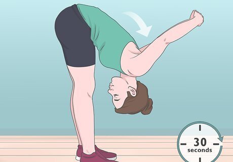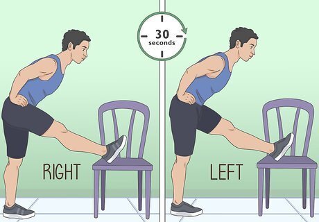 Put your heel up on something and bend forward to stretch your hamstrings. Stand up and place your right heel up on a raised surface, such as a chair, bench, or ledge. Hinge forward at your waist, so your torso is at about a 45-degree angle to your waist, and hold the position for 30 seconds. Repeat this on the other side. Don’t pick a surface that is so high that you can’t balance comfortably. Anything at about chair height is generally a good height for this stretch.