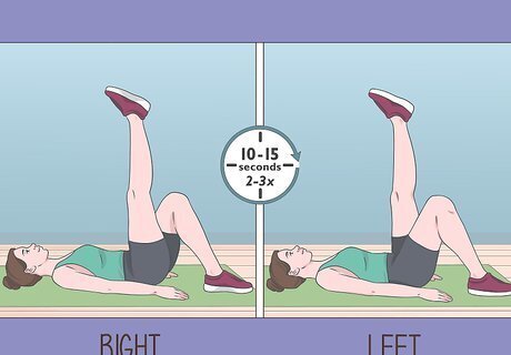Do a lying leg raise stretch to help relieve your hamstrings. Lie on your back with your knees bent, raise your right leg straight up in the air, and place both hands behind it just below your knee. Keep your left foot flat on the ground with your knee bent and pull your right leg back towards you. Hold your leg for 10-15 seconds, then release it and repeat the stretch with your other leg. You can repeat any stretch multiple times if you want to focus on certain muscles. For example, if your hamstrings feel tight, you can do this stretch 2-3 times per leg for extra relief. As an alternative to pulling your leg back with your hands, you can place a rope or strap over the bottom of your foot that’s up in the air and use it to pull your toes back towards your head.
