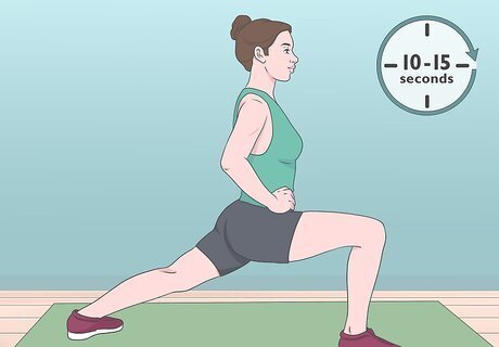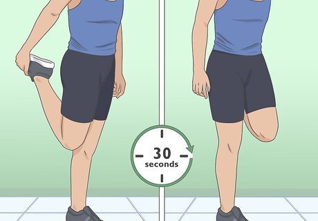 Try a kneeling leg bend to help your quads recover and practice your balance. Place your right foot forward in a lunge position, with your leg bent 90 degrees. Put your left knee on the ground, grab your left toes with your left hand, and pull your left foot back up towards your buttocks. Hold this position for 30 seconds, then switch sides and repeat the stretch. This stretch requires some balance, so take your time and stabilize yourself at each step before you move on to the next step. If it feels particularly hard to hold this stretch for 30 seconds, try focusing on your breathing while you hold it and breathe more deeply.