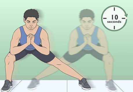 Do a side-to-side lunge stretch to relieve tightness in your inner thighs. Stand up with your feet placed wider than shoulder width apart and your toes pointing forward. Bend in 1 knee and shift your body and weight sideways to that knee, keeping your other leg straight. Go as deep as you can and hold the stretch for 10 seconds, then switch sides. You can keep going back and forth between sides for 10 seconds at a time until you feel like your inner thighs aren’t tight anymore.
