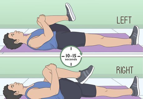 Loosen up your glutes with a lying buttocks stretch. Lie on your back and pull your knees up to your chest, then place your right leg across your left thigh. Interlace your fingers behind your left thigh and pull it back towards your chest. Hold this stretch for 10-15 seconds, then repeat it for the other side. Generally, you should try to hold a stretch for about 10-30 seconds to get good results. However, if a stretch starts hurting or feels very uncomfortable, stop immediately to avoid straining and hurting yourself. Choose your stretches based on the muscles you used during your cardio. For example, cardio exercises like running, jogging, and cycling mainly use your lower body muscles, so your post-cardio stretching should focus mainly on these muscles.
