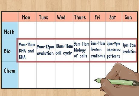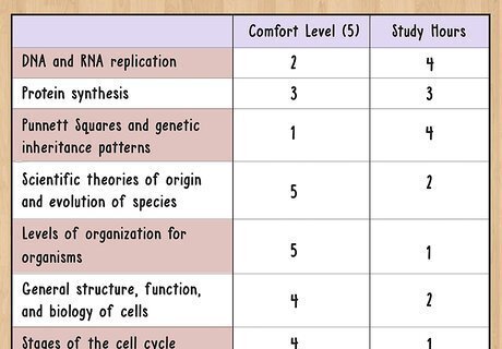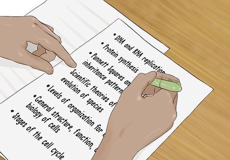 Make a list of all the topics you need to study. Making a list of topics is a great way to prioritize what you need to study so you're not spending time reviewing unnecessary information. If your teacher gave you a review packet, use this as a guide on what to study. You can also start by listing the chapter titles that were covered. Some topics you are likely to see on your exam include: DNA and RNA replication Protein synthesis Punnett Squares and genetic inheritance patterns Scientific theories of origin and evolution of species Levels of organization for organisms General structure, function, and biology of cells Stages of the cell cycle