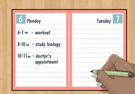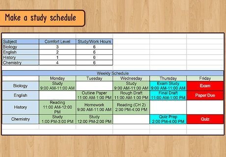 Make a study schedule. Making a study schedule will give you a clear plan of how to manage your time. You don't have to feel overwhelmed and rushed during finals week. Covering a little bit of material over a few days or weeks is a lot easier than cramming a lot of material into your brain in one night. Make your plan and stick with it to be successful.