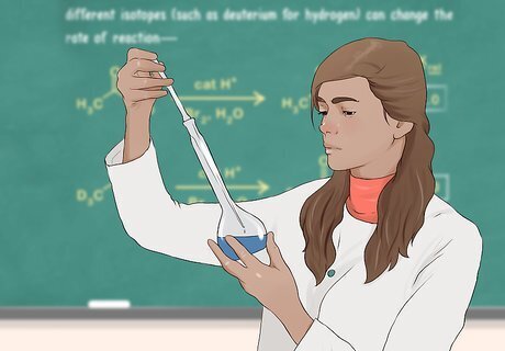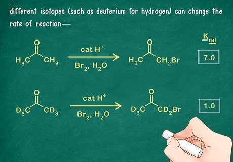 Use substitutes to track molecular interactions. Depending on the molecule, certain atoms or groups of atoms will be removed and substituted with something else. Most commonly, a hydrogen is replaced with deuterium. This allows researchers to pinpoint the location of a particular part of the hydrogen molecule that that they may be interested in. It is possible that different isotopes (such as deuterium for hydrogen) can change the rate of reaction.