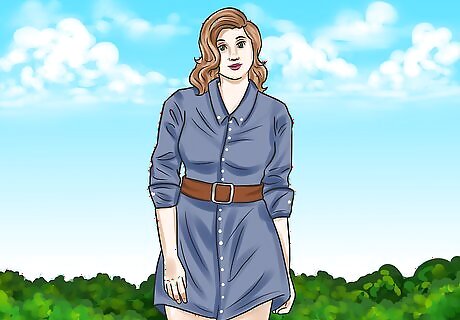 Wear it as a dress. Why purchase a “shirt dress” when you can just make one? Throw on an oversized button-down shirt as a dress for a super easy and trendy look. To avoid looking shapeless, you can add a belt or something else to cinch in the waist, creating a shape. You can cuff the sleeves so they aren’t too long, and voila!