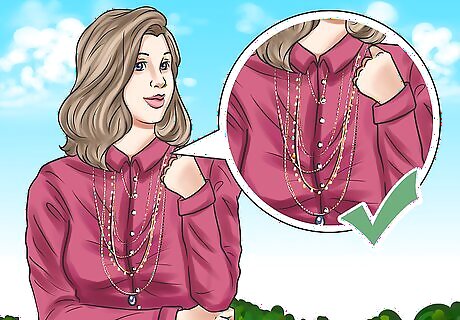 Add a bold statement necklace. Most people leave a few buttons undone at the top of their shirt, letting it expose a bit of skin near the neck. Instead, try buttoning up your shirt to the very top button, and then placing a big, eye-catching necklace around the collar. This is looks extremely chic, and can make any button-down shirt immediately look stylish.