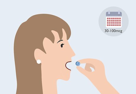 Take 30-100 micrograms of biotin per day. Although there is no Recommended Daily Allowance (RDA) for biotin, it is recommended that adequate intake for proper health is between 30 and 100 micrograms per day, though some people may need more if they are deficient. Often supplements have dosages many times higher than this in one pill, so you may want to create a schedule. For example, if your supplement has 1,000 micrograms per pill, you may only want to take one per week. Most biotin supplements come in pill form; if you are using one of these, take it with water as you would any other pill. Biotin can also come in liquid form. Follow the instructions given to figure out dosage based on the volume.