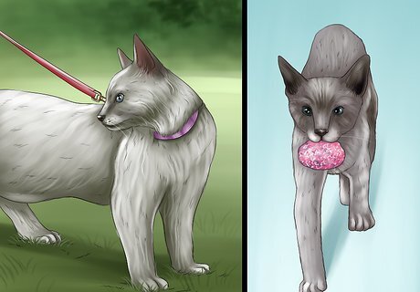 Train your cat. The Javanese is a highly intelligent and energetic breed that can be trained to fetch and walk on a leash. Attempt training just before mealtime, when your cat will be alert and eager. Use treats as a reward for when your cat retrieves a toy for you or allows you to attach it's harness without struggling. To get your cat to fetch, dangle the object in front of it (e.g. a toy mouse), toss it onto the ground in front of you, and call your cat back to you if it picks up the toy. The process will require patience, and trial and error. Once your cat brings the toy back to you (however long it takes), reward it with a treat and praise, and keep up the process to solidify the training. It’s also possible to train your cat with a clicker. The cat learns to associate a clicker with a treat, which you can use to reinforce desired behaviors.