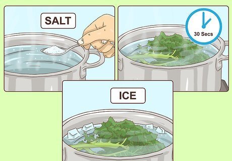 Blanch your greens. If you overcook your green vegetables, you may not be getting a desirable amount of chlorophyll, since cooking will reduce the amount of chlorophyll in the dish. Instead of cooking for a long time, blanch greens like kale or broccoli. Place a bowl of ice water in the sink. Then, bring a pot of water to a boil on the stove. Add a teaspoon of salt to the water. Throw your vegetables in the water for thirty seconds, scoop them out and cool them in the ice water. Add them to your recipe and enjoy.