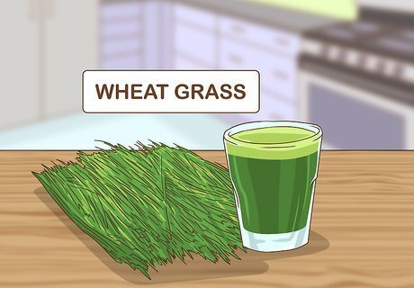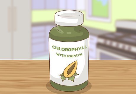 Supplement your diet with wheatgrass shots. One of the best sources of chlorophyll is wheat grass. You can juice wheatgrass with any regular fruit juicer. Wash the wheat grass. If you spot any mold, throw it out. Juice and enjoy a shot of wheat grass on its own, or add it to an orange or carrot juice to improve the flavor.