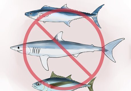 Avoid mercury-rich predator fish, such as shark, swordfish, and king mackerel. Mercury exposure can disrupt and destroy neurological and organ health, and it's particularly harmful to young children and fetuses. Indeed, the U.S. government estimates that as many as 75,000 newborns each year are at higher risk of developing learning disabilities later in life due to mercury exposure in the womb. You can limit your exposure to mercury by cutting out your consumption of predatory fish, such as shark, king mackerel, and tuna. Even if you're eating wild salmon, don't eat more than two portions a week, as it can still contain pollutants harmful to you and your baby, such as dioxins and polychlorinated biphenyls (PCBs).
