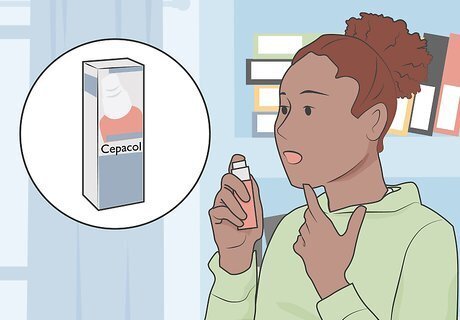 Ease the pain of a sore throat with numbing sprays. Sprays containing either dyclonine (Cepacol) and phenol (Chloraseptic) will numb the tissues in your throat, relieving pain when you swallow, speak, or cough. Shake the bottle before holding the nozzle up to your open mouth and applying 5 sprays. Wait 15 seconds and then spit the fluid out. Do this every 2 hours as needed. Don’t use more than the recommended dose. If you think you or your child has taken too much or if hives, itchy skin, wheezing, chest or throat tightness occur, seek medical care as soon as you can. Children under 12 years old should only apply 3 sprays at a time and should be supervised while using the spray. Ask your doctor about using it for children under 3 years of age. As an alternative, suck on a menthol throat lozenge every 1 to 2 hours to soothe a sore throat.