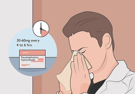 Clear blocked sinuses with a decongestant every 4 to 6 hours. Oral decongestants like pseudoephedrine (Sudafed and Contac Non-Drowsy) and phenylephrine (Sudafed PE) can help stop a runny nose and relieve postnasal drip by shrinking the blood vessels in your nasal passages. Take 30 to 60 mg of immediate-release pseudoephedrine every 4 to 6 hours, as needed. For 12-hour release pseudoephedrine, take 120 mg every 12 hours. For a 24-hour extended-release blend, take 240 mg once per day at the same time. Use 10 mg of phenylephrine every 4 hours, as needed. Don’t take more than 240 mg of pseudoephedrine or 60 mg of phenylephrine per day. If you have high blood pressure or prostate problems, talk to your doctor before taking decongestants. If you take duloxetine (Cymbalta) or amphetamine (Adderall), talk to your doctor before taking pseudoephedrine. The interaction between these drugs could raise your blood pressure and heart rate to potentially dangerous levels.Warning: Decongestant nasal sprays are also a good option for immediate relief. However, don't use them for more than 3 to 5 days because your symptoms may get worse from repeated use. This is a common problem with oxymetazoline (Afrin) nasal spray, which is highly addictive when people use it repeatedly for congestion.