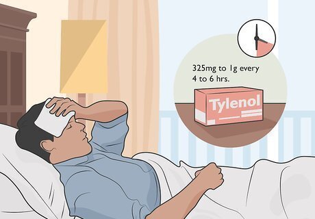 Take acetaminophen to reduce fever and ease any pain. Acetaminophen (Tylenol) can help bring down a high fever and combat associated symptoms like headaches, body pains, and sinus congestion. Adults can safely take 325 mg to 1 g (1 or 2 tablets depending on the strength) every 4 to 6 hours. If you’re treating a child’s fever, use a children’s formula and determine the dosage based on their weight. An infant weighing 6 lb (2.7 kg) to 11 lb (5.0 kg) can safely take 40 mg of children’s Tylenol. For every 5 lb (2.3 kg) above that, the dosage increases by 40 mg. For instance, a child weighing 12 lb (5.4 kg) to 17 lb (7.7 kg) can take 80 mg, and a child weighing 18 lb (8.2 kg) to 23 pounds (10 kg) can take 120 mg. If you’ve ever had liver cirrhosis or if you drink more than 3 alcoholic drinks a day, talk to your doctor about finding an alternative to acetaminophen. Acetaminophen can pass into breast milk, so talk to your doctor before taking it if you’re pregnant or breastfeeding. Don’t take more than 1,000 mg at any one time or over 4,000 mg within 24 hours. Overdosing can harm your liver or lead to severe complications. If you experience jaundice, dark urine, loss of appetite, stomach pain, itching, or nausea, call for emergency medical care.