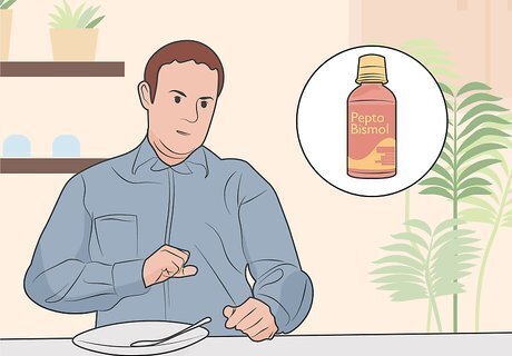 Ease heartburn, nausea, and indigestion with medications containing bismuth. Bismuth is the main active ingredient in the brand Pepto-Bismol, which is a common medication to treat gastrointestinal problems due to eating (or overeating) certain foods and drinks. If you’re using a liquid form, shake it before pouring 2 tablespoons (30 mL) into the dose cup. Swallow this amount once per hour as needed and don’t take more than 8 doses equal to 16 tablespoons (240 mL) in 1 day. To take bismuth in tablet form, chew or dissolve 2 262-mg tablets in your mouth every hour as needed. Don’t take more than 16 tablets in 1 day. For children under 12 years of age, use a formula made especially for children and adhere to the dosing guide on the bottle. Don’t take medications containing bismuth if you are allergic to salicylates (like aspirin), if you have a stomach ulcer, or if you’re experiencing bloody or black stools. If you’re taking anticoagulants (blood thinners) or medications for diabetes, gout, or arthritis, ask your doctor before taking anything containing bismuth.Warning: Be aware that bismuth can turn stool black, which may lead to fears about blood in the stool. However, the change in color is only due to the medication and not due to bleeding.