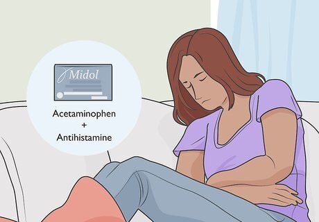 Use a blend of acetaminophen and antihistamine to soothe menstrual cramps. OTC drugs made to treat menstrual pain (like Midol) contain a combination of useful ingredients: acetaminophen to relieve pain, caffeine to decrease bloating and boost energy, and pyrilamine maleate (antihistamine) to reduce water retention. Take it to ease menstrual cramps and any pain associated with muscles or joints. If you’re using Midol Complete, take 2 capsules with 8 fluid ounces (240 mL) of water every 6 hours as needed. Since Midol Complete contains acetaminophen, you shouldn’t take it if you have ever had or currently have liver damage. You should also avoid taking it with any other drug that contains acetaminophen. If you experience fever, blisters, hives, red skin, rashing, blisters, or wheezing, seek medical help right away.