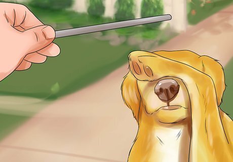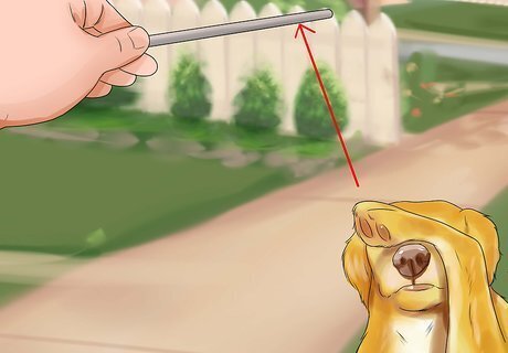 Move the target. Instead of clicking and rewarding your dog when it steps on the stick, life the stick with your hand about halfway up the dog’s body. Hold it close enough that the dog does not need to move forward to touch the target, but can simply reach its paw out to make contact with it. If your dog is 30 centimeters tall, hold the ruler or stick in front of him or her at a height of approximately 15 centimeters. When your dog places its paw on the target, squeeze the clicker and administer either a dog treat or generous verbal praise. Your dog should recognize that stepping on the target stick is still the goal even though it has changed position. However, you may need to demonstrate to your dog how to step on the stick. Take its paw in your hand and place it on the stick directly one or two times, then click your clicker and administer a treat when after it has held the position for two or three seconds.